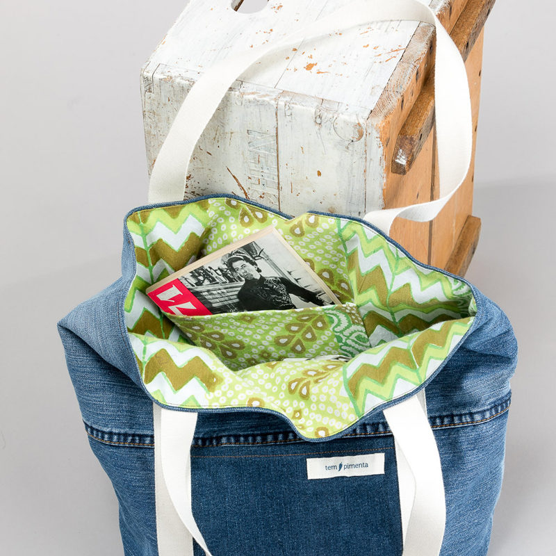 Palmito is part of the ONE collection’s line of upcycled accessories. It is a large handbag made from 2nd hand jeans and lined with a recycled fabric as well. The straps are new, made of Oeko-tex certified organic cotton. It has an inside pocket and an outside pocket.